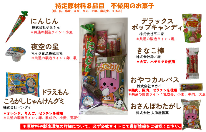 お菓子は、原材料をしっかり把握できるものを事前に準備しておきましょう。