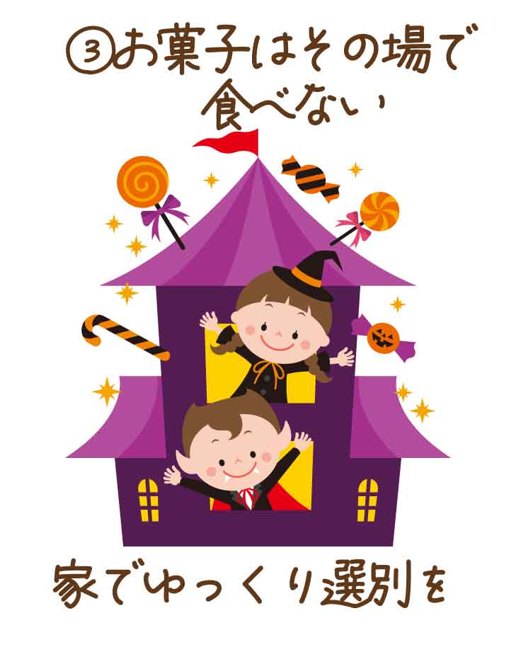 ハロウィンでは、ついもらったその場でお菓子を食べたくなりますが、まずは家に帰ってから食べる、など各家庭のルールを徹底させましょう。これは、今後自身を守るための大切な練習にもなります。